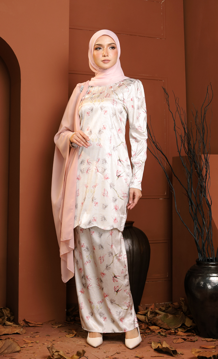 The Aminie Kurung features an elegant crafted from fine floral printed satin that exudes a soft and feminine touch. It showcases a round neckline with pleated detailing for a sophisticated front dimension. The hemline is adorned with a scallop pattern for a luxurious finish, while the back skirt is designed with back pleat for graceful, flowing movement. Layered with luxurious satin jacquard silk, this kurung drapes beautifully, presenting a refined and modern elegance — perfect for formal events or special occasions.