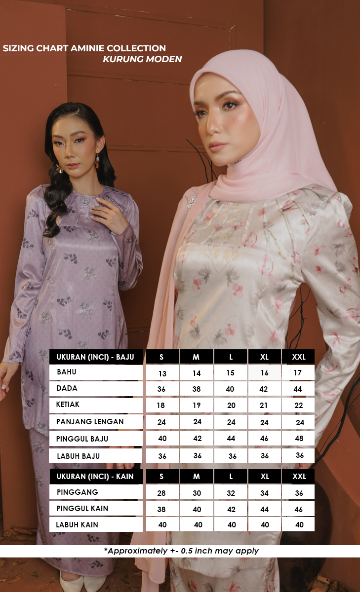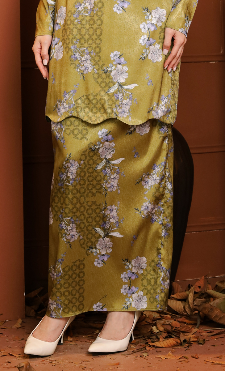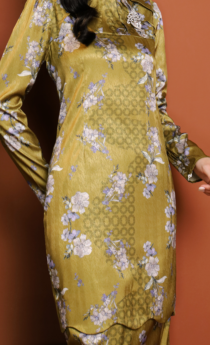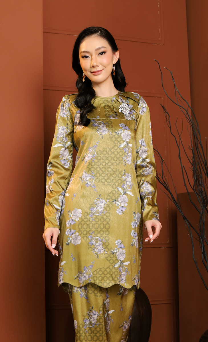 The Aminie Kurung features an elegant crafted from fine floral printed satin that exudes a soft and feminine touch. It showcases a round neckline with pleated detailing for a sophisticated front dimension. The hemline is adorned with a scallop pattern for a luxurious finish, while the back skirt is designed with back pleat for graceful, flowing movement. Layered with luxurious satin jacquard silk, this kurung drapes beautifully, presenting a refined and modern elegance — perfect for formal events or special occasions.