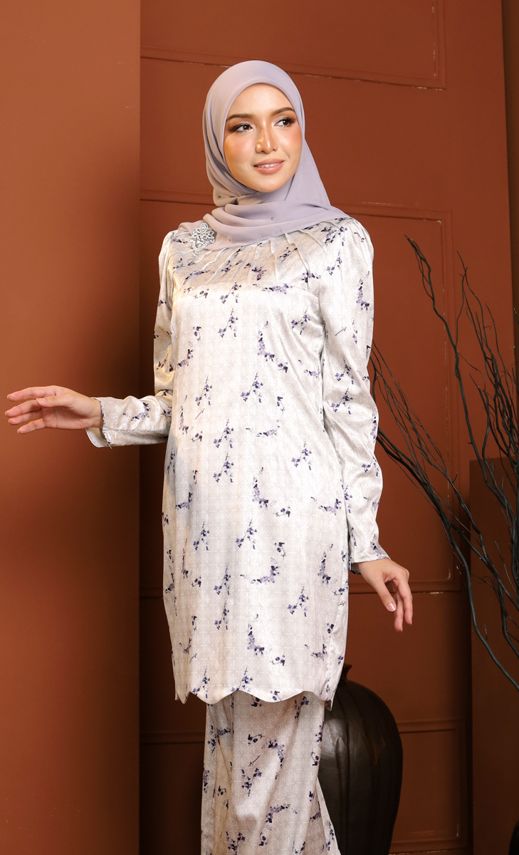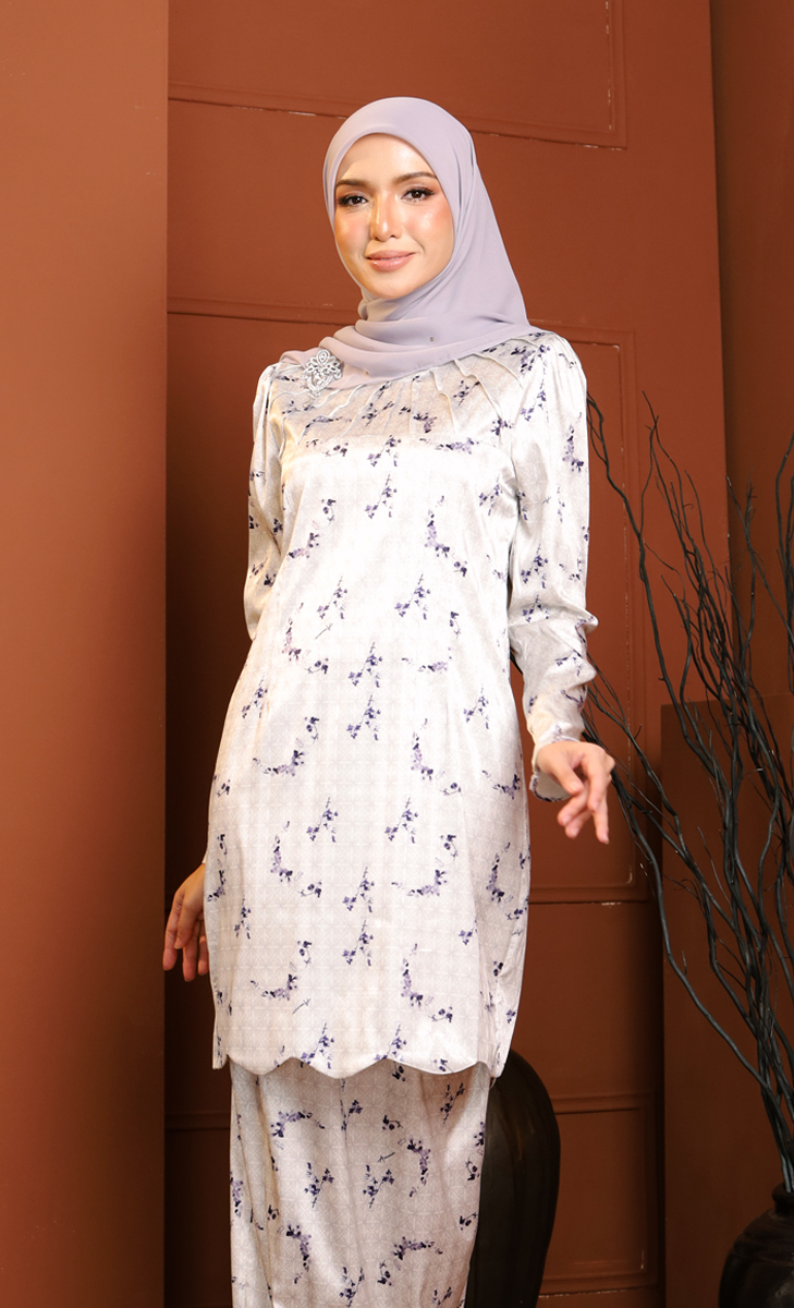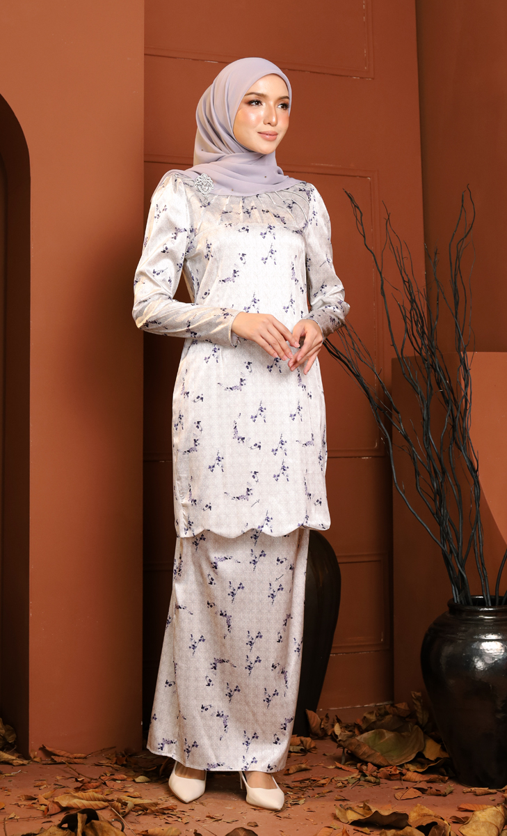 The Aminie Kurung features an elegant crafted from fine floral printed satin that exudes a soft and feminine touch. It showcases a round neckline with pleated detailing for a sophisticated front dimension. The hemline is adorned with a scallop pattern for a luxurious finish, while the back skirt is designed with back pleat for graceful, flowing movement. Layered with luxurious satin jacquard silk, this kurung drapes beautifully, presenting a refined and modern elegance — perfect for formal events or special occasions.