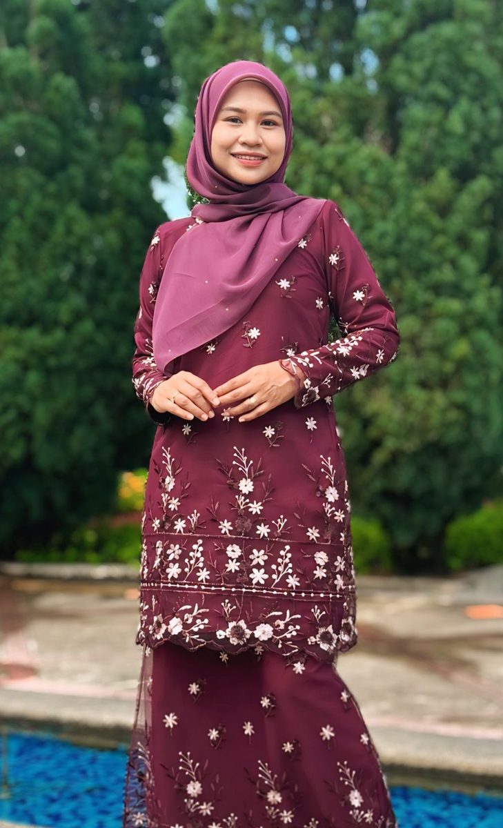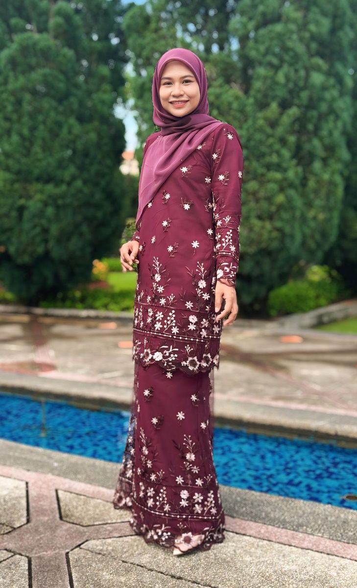 – cutting kurung moden medium longgar, leher bulat zip panjang di belakang mudah pakai, lengan potongan slim fit – ada zip mudah wudhuk”