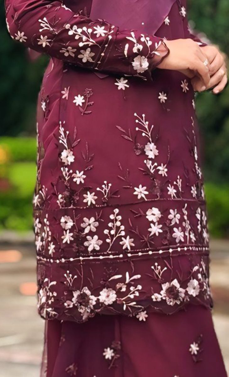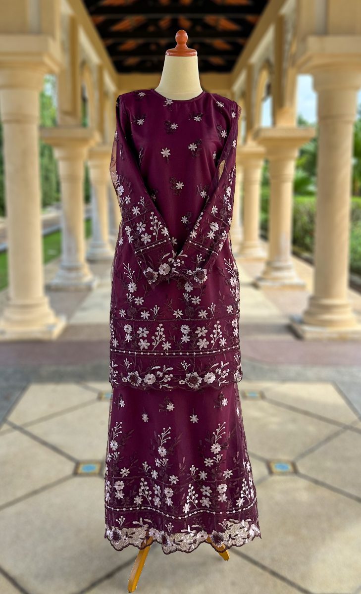 – “full lace” tulle dengan hiasan sulaman corak bunga ( Flower & Scallop Embroidery) di bahagian tangan & bawah keliling baju