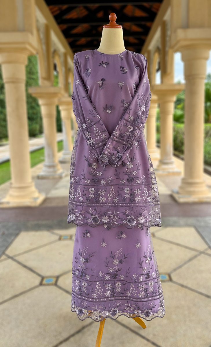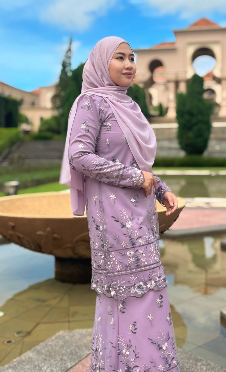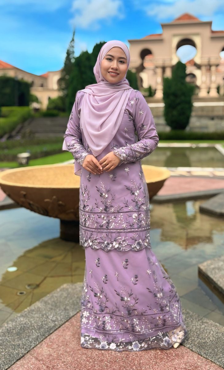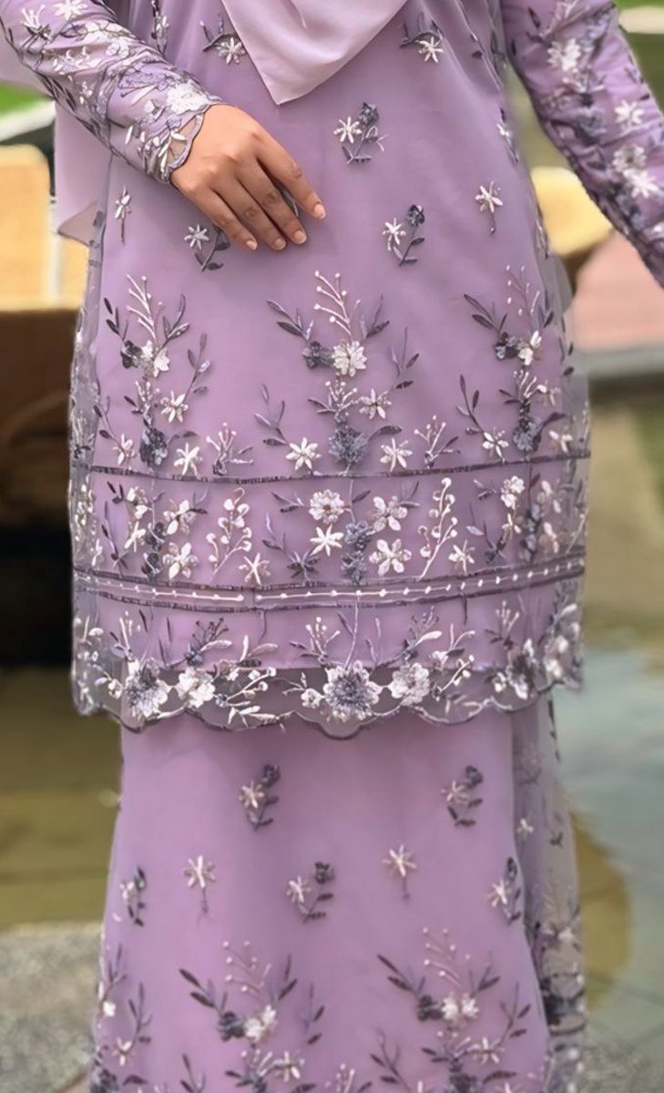– “full lace” tulle dengan hiasan sulaman corak bunga ( Flower & Scallop Embroidery) di bahagian tangan & bawah keliling baju