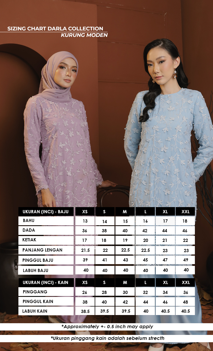 The Darla Kurung is crafted from luxurious 3D Cotton Flower embroidery, the top and skirt of the Darla Kurung are lined with Premium Satin, offering both comfort and elegance. The intricate flower lace motifs are inspired by the natural beauty of flora, bringing a sense of simplicity and modernity that will transport you to a world of graceful sophistication. The carefully designed cut of the kurung modern ensures comfort and ease, allowing for effortless movement throughout the day.