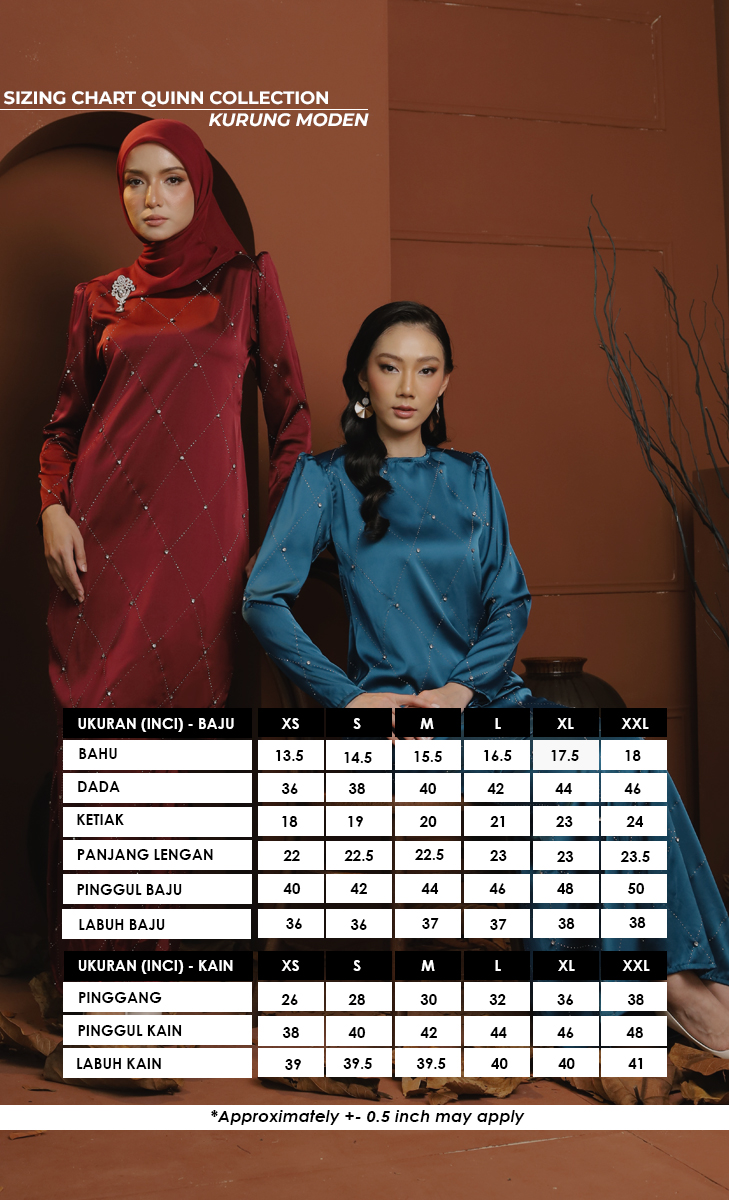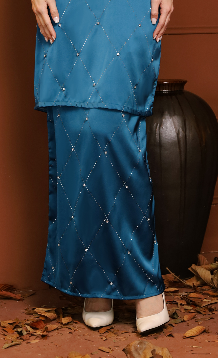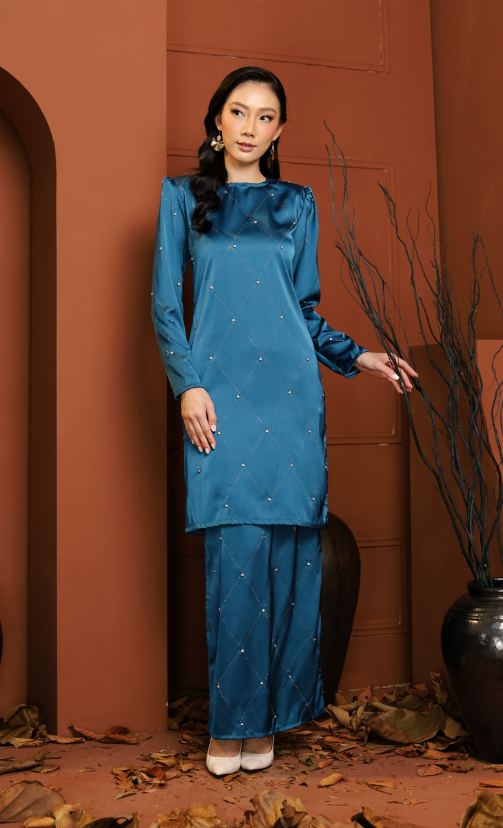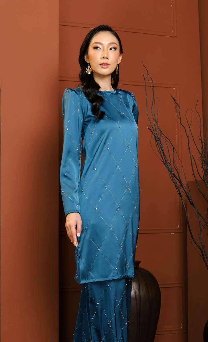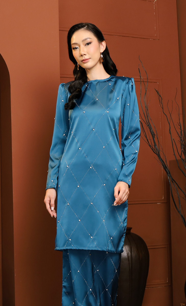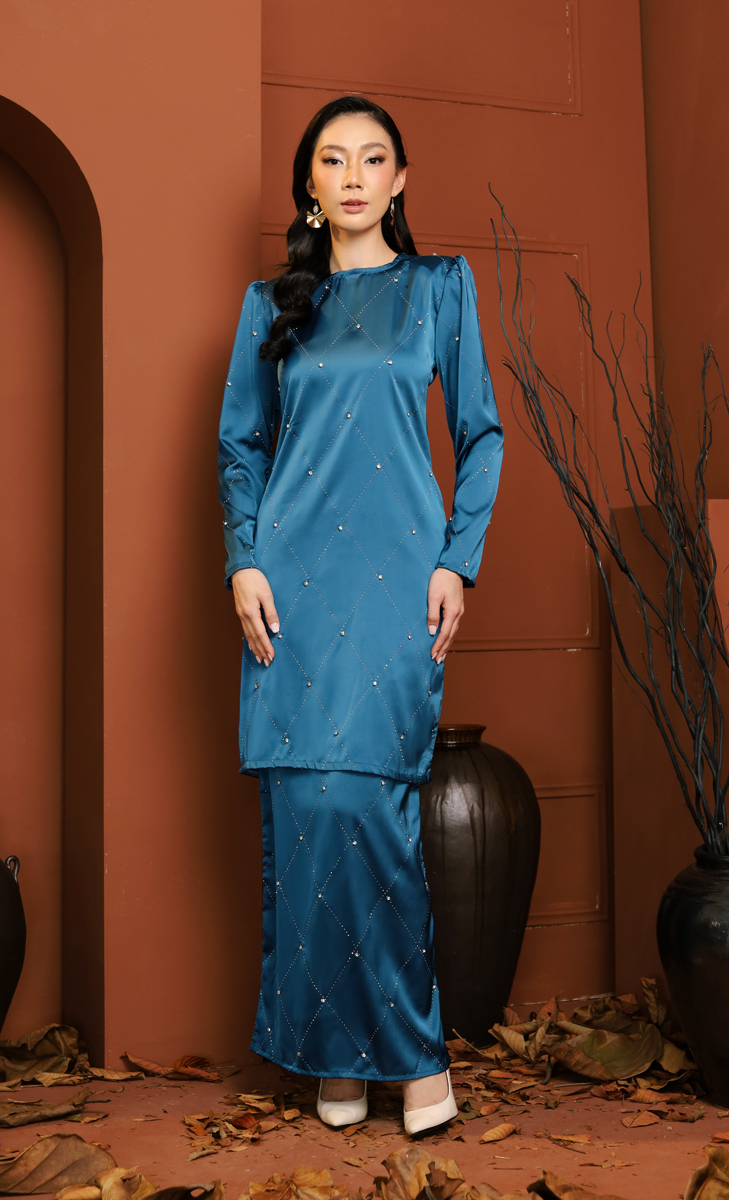 Quinn Diamond Kurung is tailored from lustrous satin, creating a refined soft sheen. The round neckline and puff shoulder adds structured dimension and elevates the minimalist bodice design. Diamond beaded with rhinestone adorns full the Quinn kurung, arranged in lattice diamond motifs. Subtle rhinestone crystal accents are scattered across the front, enhancing the sophisticated allure. The look is completed with a full diamond and rhinestone crystal skirt, adding graceful texture and flow to the overall